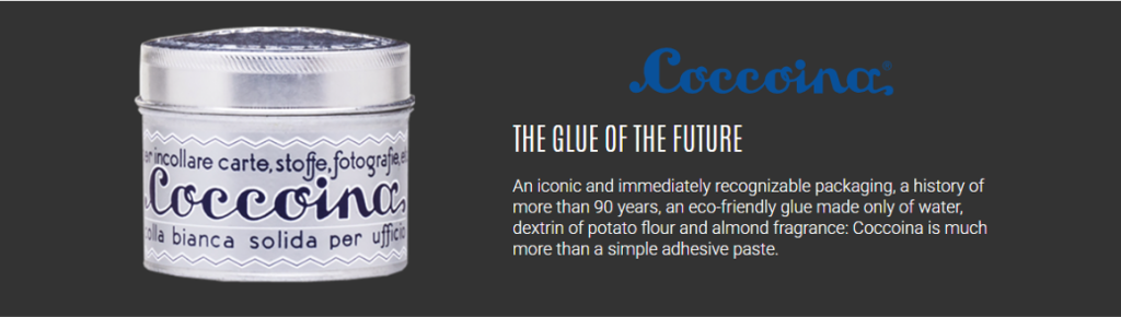 さらに、1927年には「Coccoina(コッコイーナ)」というアーモンドの香りが特徴的な白い紙用接着剤を発売。ユニークな香りと美しいデザインで、世界中のファンに愛され続けています。